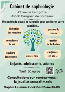 Tarifs séance individuelle – 1h : 50€ séance de groupe (devis entreprise/association sur demande) – 1h : entre 8€ et 15€/p.p Infos et prise de rdv : sophie.sophro33@gmail.com +33 682443305